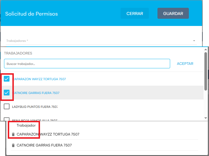 Al solicitar un Permios o unas Vacaciones, se permite una selección múltiple de los trabajadores.