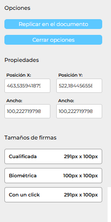 En la ubicación de la firma, aparece representada con las medidas que tendría.