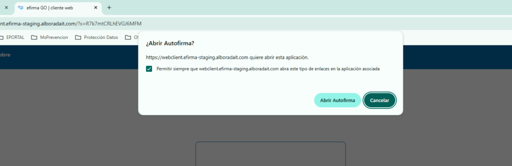 El navegador pedirá, la primera vez, confirmación de uso de Autofirma. Si no la tiene instalada, el proceso lanzará la instalación de la misma.