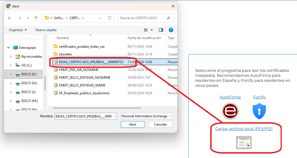 Desde la pantalla, se permite la selección del archivo del certificado, para su uso en la firma.