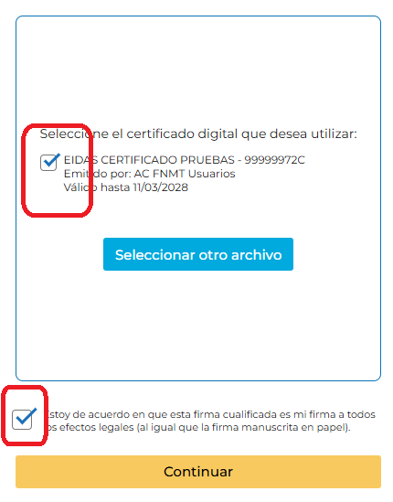 Una vez incorporado el certificado, se ha de seleccionar y como el proceso normal de efirma, aceptar la conformidad de que esa firma corresponde a la firma del destinatario.