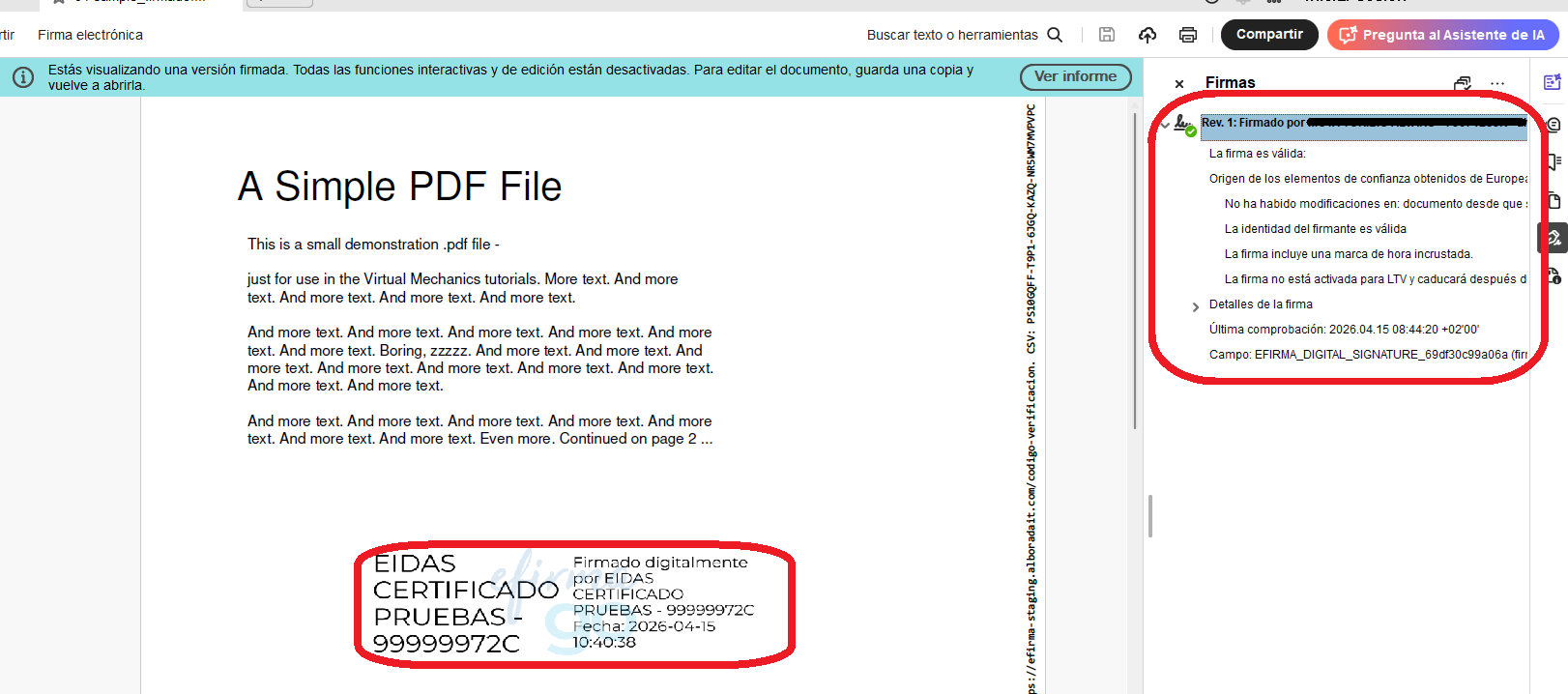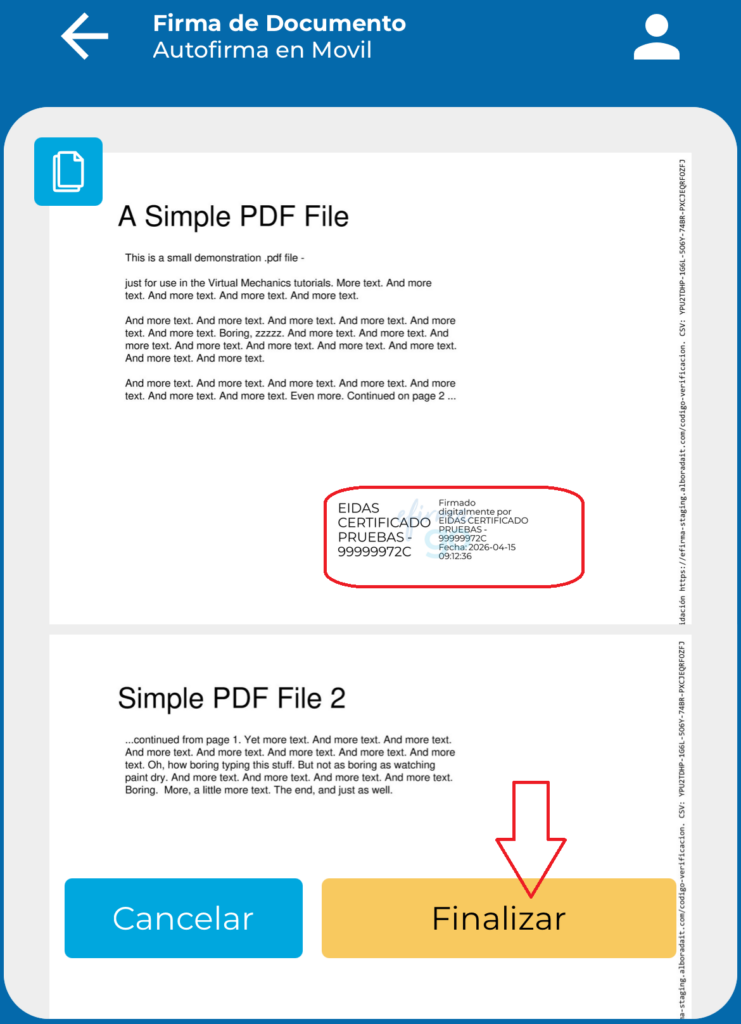Para continuar, se confirma la firma y el documento queda firmado con nuestro certificado.