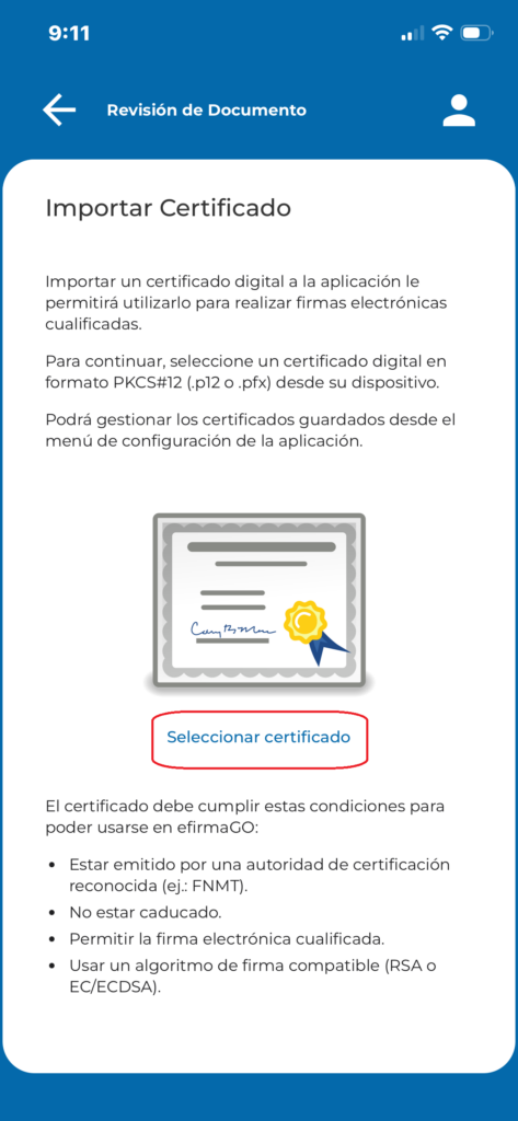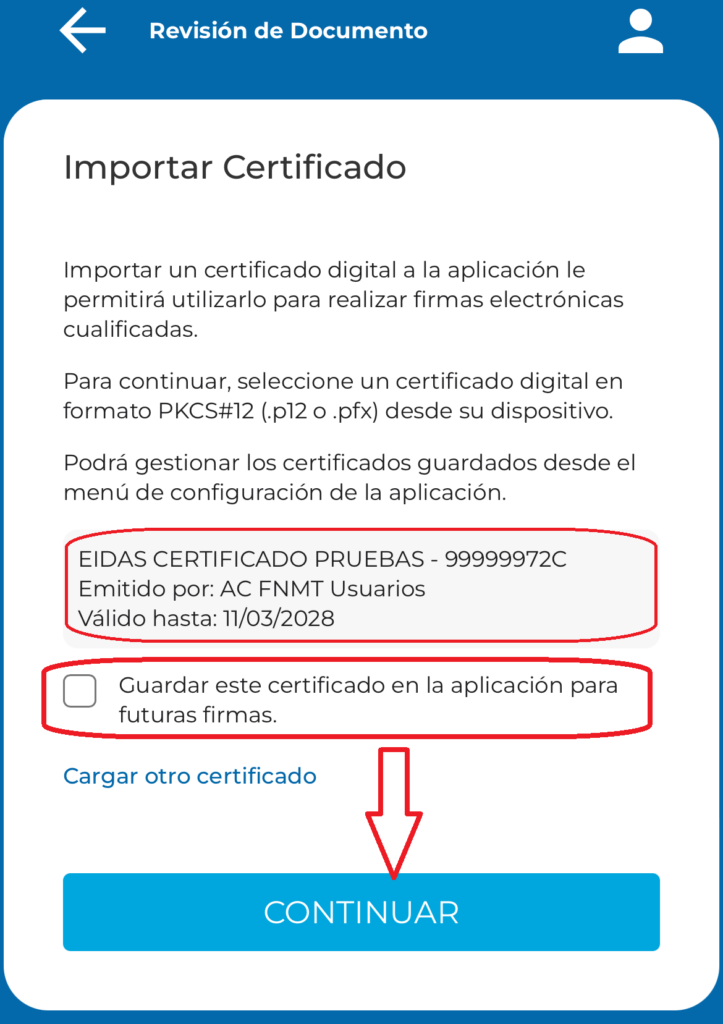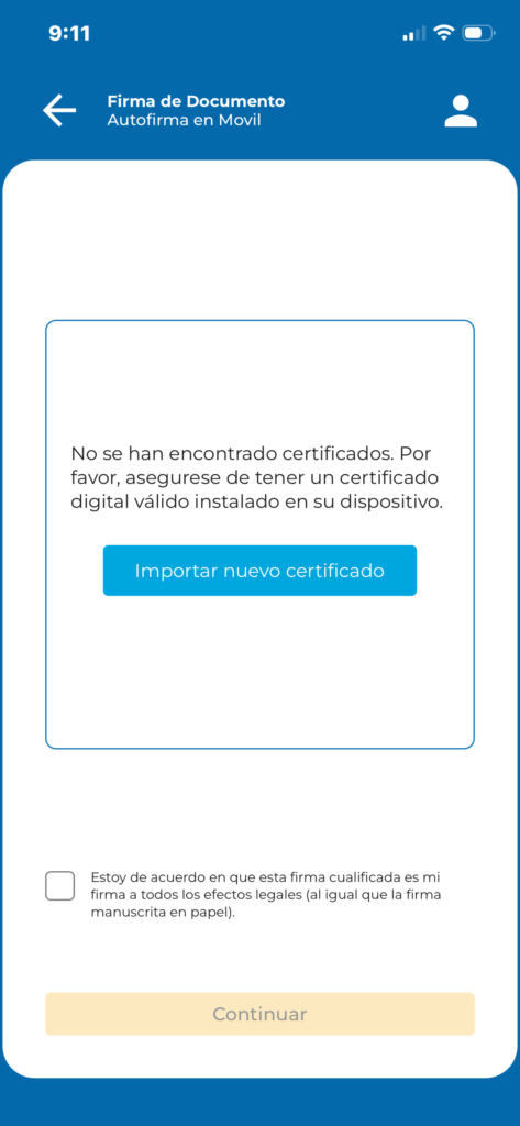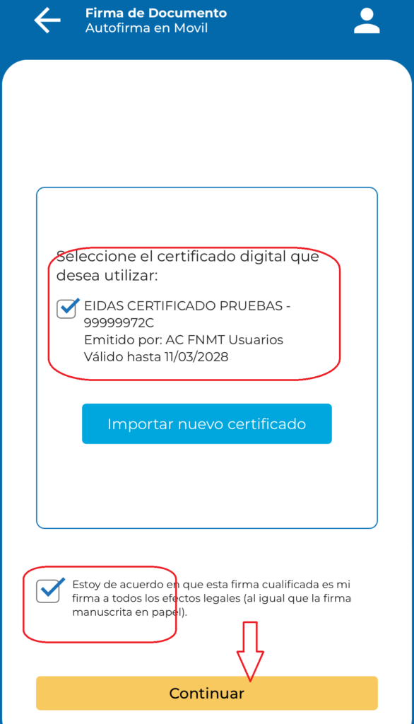 Para poder firmar con el certificado digital, desde la aplicación móvil de efirma, primero debe estar instalado el certificado en el móvil.