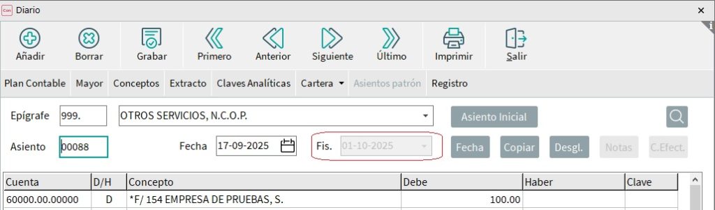 Al seleccionar esta opción, los informes se elaboran tomando como referencia la fecha fiscal de los asientos en lugar de la contable. Esta funcionalidad resulta especialmente práctica cuando, desde el registro, se contabiliza una factura cuya fecha de factura difiere de la fecha fiscal, lo que da lugar a un asiento de diario con ambas fechas diferenciadas.
