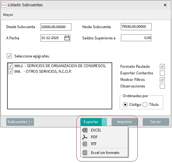 - EXCEL → mantiene el diseño original del listado tal como lo genera el programa.