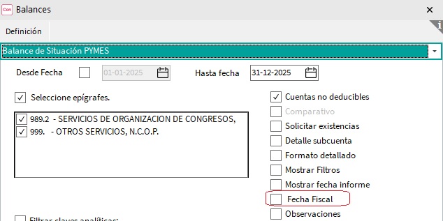 En esta actualización se incorpora una mejora en los informes de Balance de Situación y de Cuenta de Pérdidas y Ganancias con la inclusión de la nueva casilla “Fecha fiscal”.