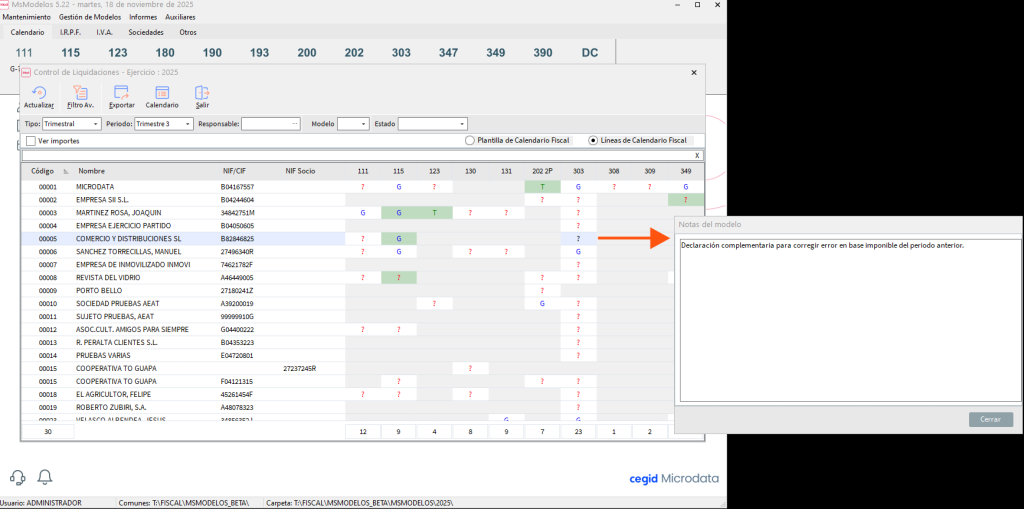 Ahora puedes incluir comentarios directamente desde el control de liquidaciones. Solo tienes que situarte sobre la casilla del modelo (donde se muestra su estado), hacer clic con el botón derecho y accederás a una ventana para escribir notas relacionadas con la liquidación correspondiente.