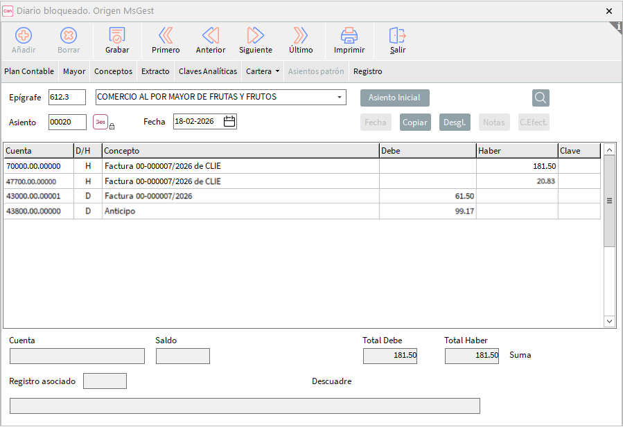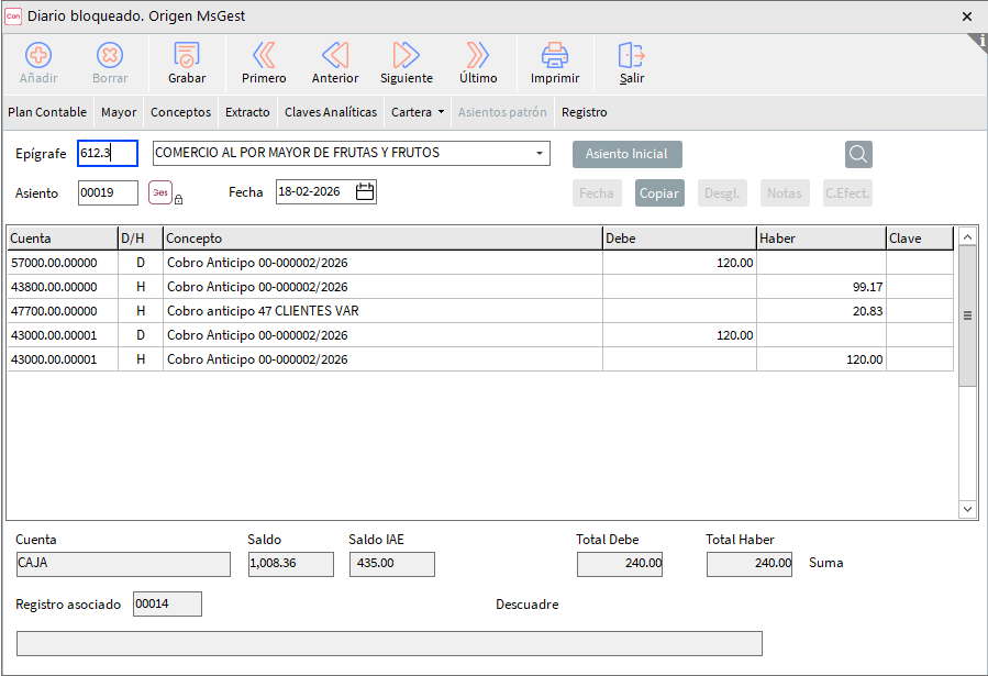 Si marcamos está opción además de quedar la entrega de dinero marcada como Anticipo, en caso de disponer de nuestra aplicación de contabilidad, se generará un asiento contable con el Anticipo al sincronizar los datos:
