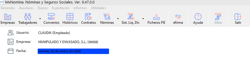 Por otra parte, al iniciar la aplicación por defecto se accede con fecha del día actual, es decir, del año 2025 (en este caso), por tanto, si se desea calcular Nóminas, Seguros Sociales, 190 ó 111 del año 2025 se ha de cambiar la fecha de trabajo.