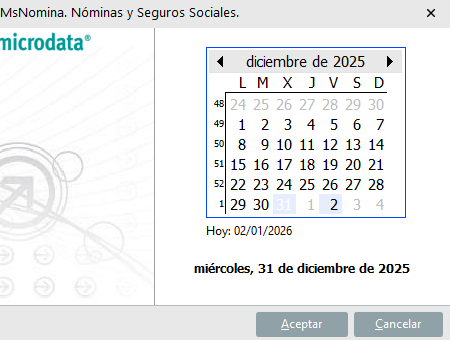Para ello, desde la pantalla inicial de MsNomina, se pulsa sobre el campo de Fecha de Trabajo y sobre el calendario se modifica el año: