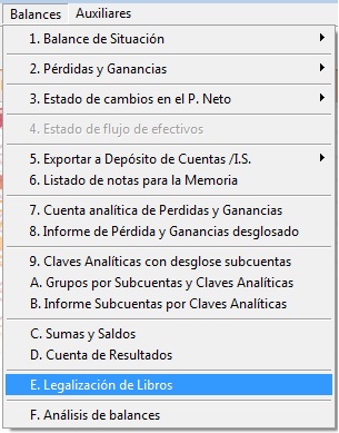 Para ello, la opción se encuentra en el menú “Balances” → “E. Legalización de Libros”