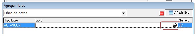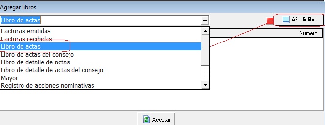 - Seleccionar libro en el desplegable, p.e, “libro de actas” y se pulsa el botón de la derecha “Añadir libro”