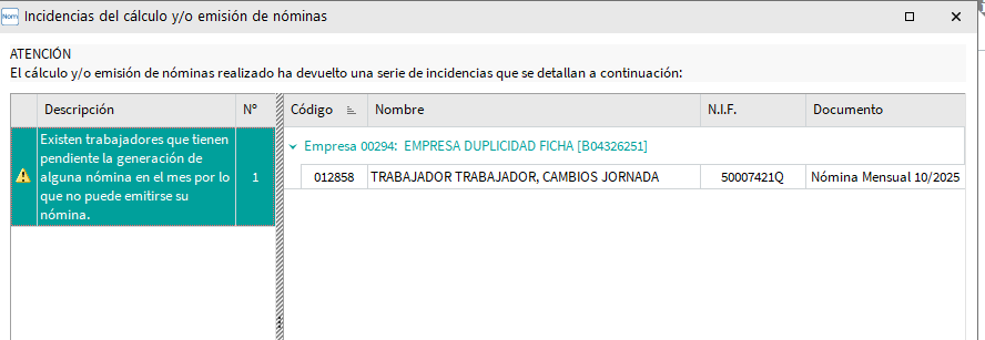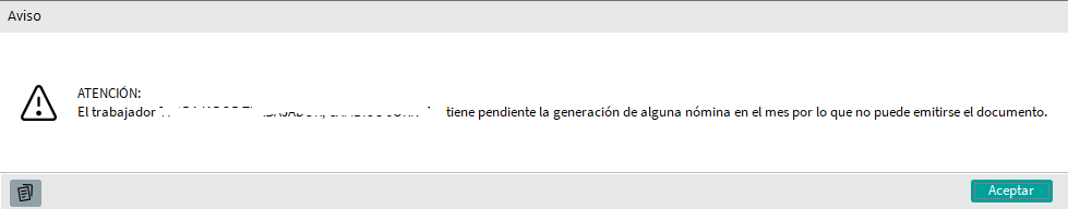 b) Todas las nominas del periodo han de estar generadas. En el caso de que alguna de las nominas no este grabada, aparecerá el siguiente mensaje:
