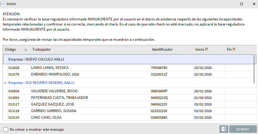 En el caso de que la nómina de Febrero/2026 este calculada con una base reguladora erróneamente informada en el diario de asistencia, deberá recalcular dicha nómina (sin el check marcado o borrando el importe de base reguladora).